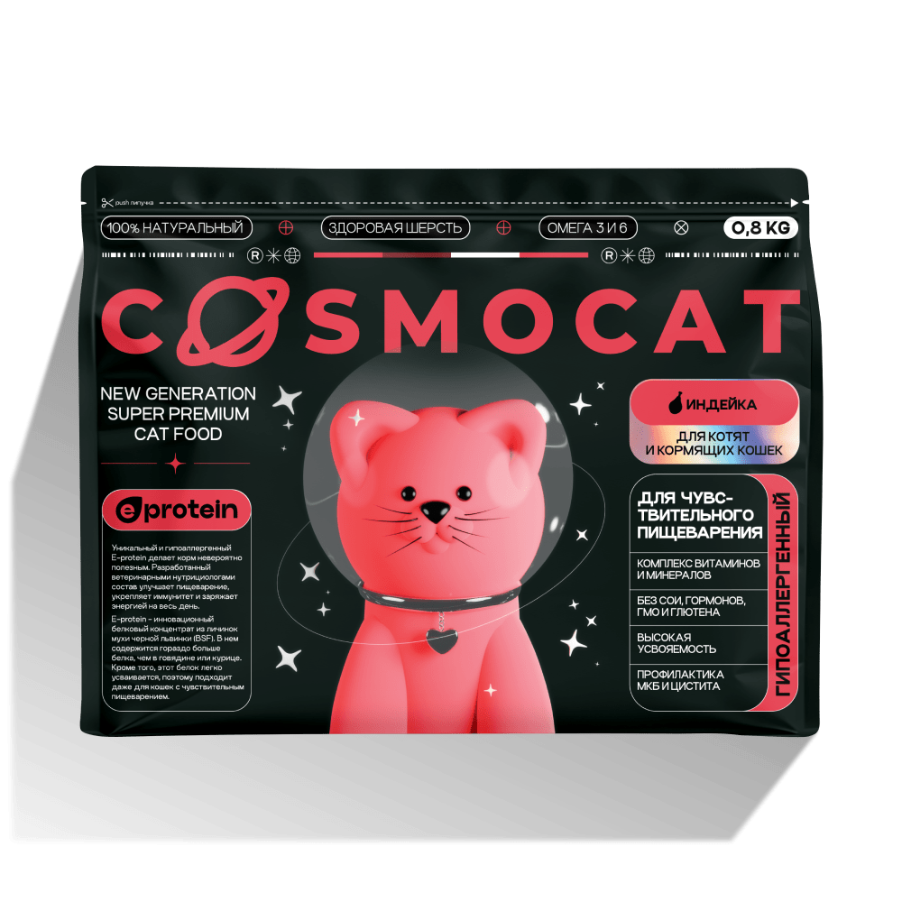 Этот легкоусвояемый рацион содержит исключительно натуральные ингредиенты. Он обогащён белком, витаминами, минералами и антиоксидантами. Благодаря своей высокопитательной рецептуре, Cosmocat способствует здоровому росту и развитию котёнка.