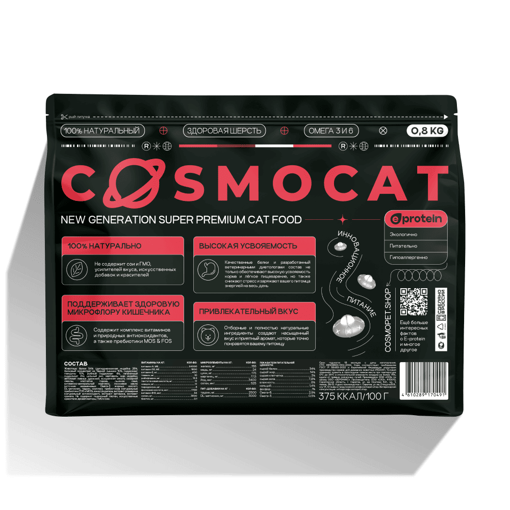 В основе рецепта — наш эксклюзивный компонент E-protein и преимущества, которые он дарит: высокий процент белка, богатый запас витаминов, минералов и аминокислот. Мы дополнили его натуральным вкусом, ароматом и полезными свойствами рыбы, чтобы осчастливить абсолютно любую кошку