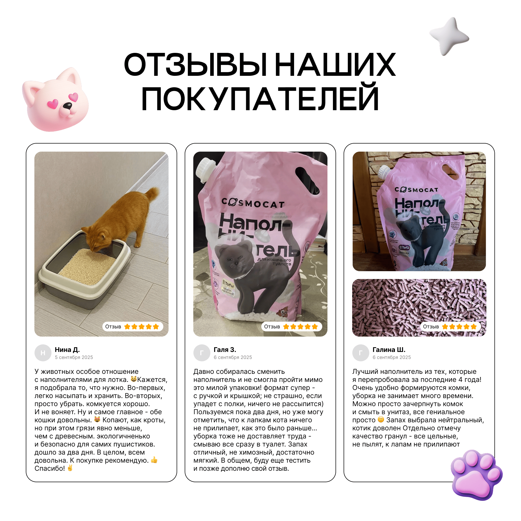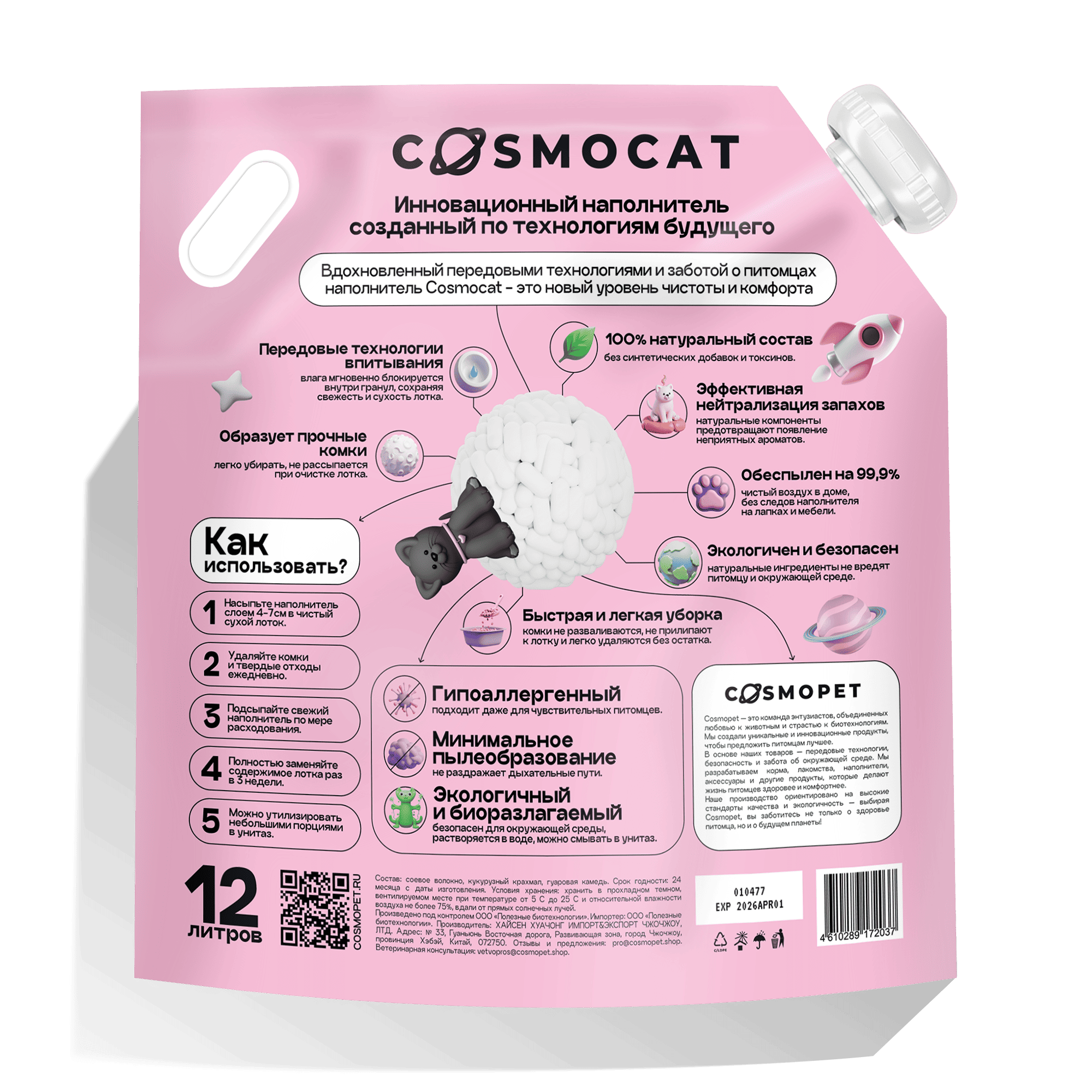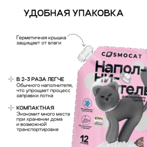 Вдохновленный передовыми технологиями и заботой о питомцах наполнитель для кошачьего туалета Cоsmocat — новый уровень чистоты и комфорта для вас и вашего питомца.
