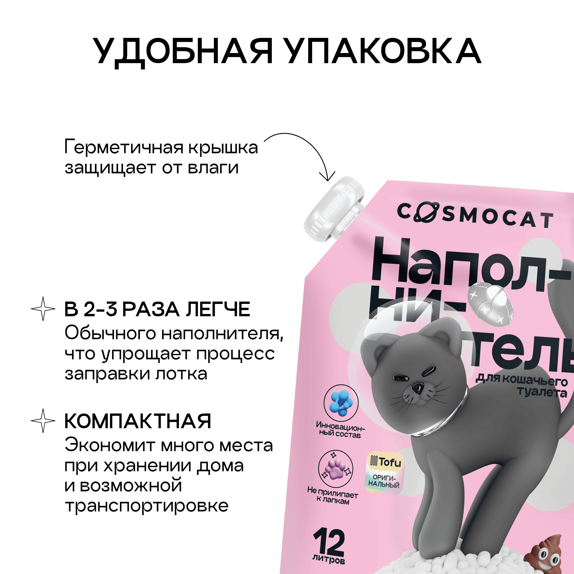 Нежный к чувствительным кошачьим лапкам и надежно блокирующий неприятный запах наполнитель премиум-класса «Тофу» от Cosmocat обладает целым рядом преимуществ. Он: