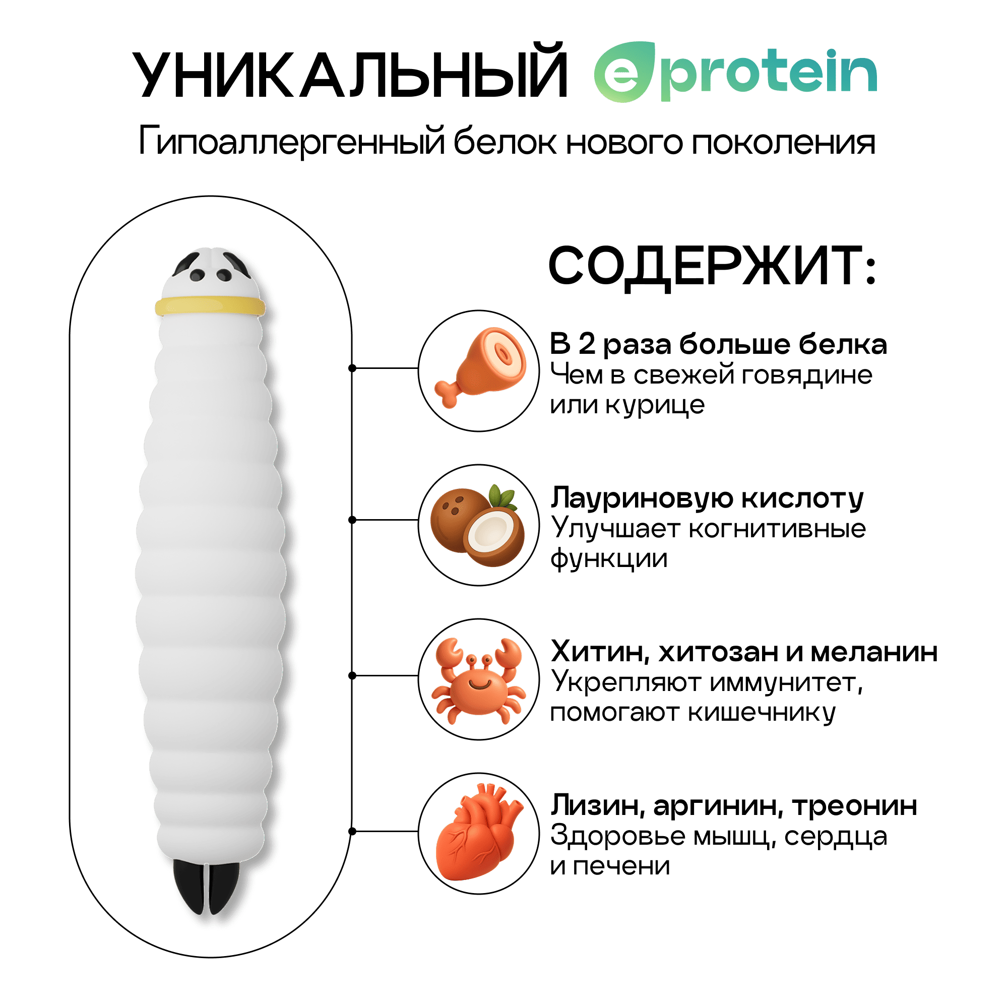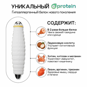 E-protein – гипоаллергенный и легкоусвояемый белок, полученный из личинок насекомого чёрная львинка. Это экологически чистый белок.
