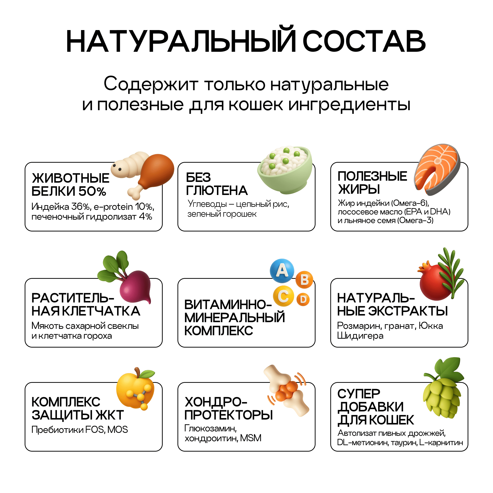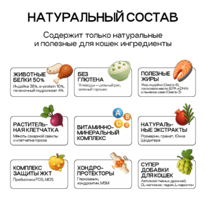 Животные белки 48% (дегидрированная индейка 34%, белковый концентрат из Черной львинки 10%, печеночный гидролизат 4%), цельный рис, зеленый горошек, жир индейки, автолизат пивных дрожжей, растительная клетчатка (в т.ч. псиллиум), высушенная мякоть сахарной свеклы, витаминно-минеральный комплекс, лососевое масло (источник незаменимых жирных кислот EPA и DHA), льняное семя (источник незаменимых Омега-3 и Омега-6 жирных кислот), DL-метионин, таурин, комплекс пребиотиков (натуральные пребиотики FOS и MOS), Юкка шидигера, экстракт розмарина (натуральный антиоксидант), экстракт артишока, экстракт граната.